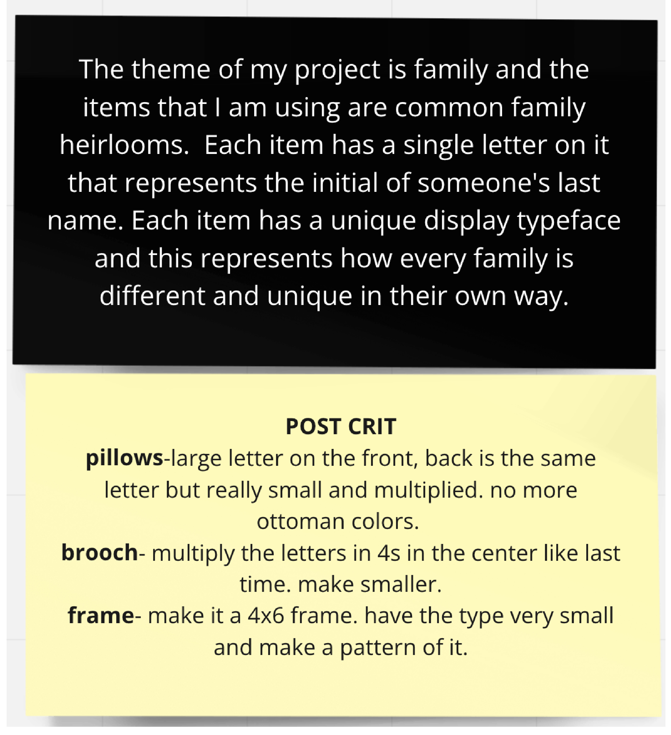 Project Concept Statement -The theme of my project is family and the items that I am using are common family heirlooms. Each item has a single letter on it that represents a family’s last name. Each item has a unique display typeface that represents how every family is different and unique in their own way.
